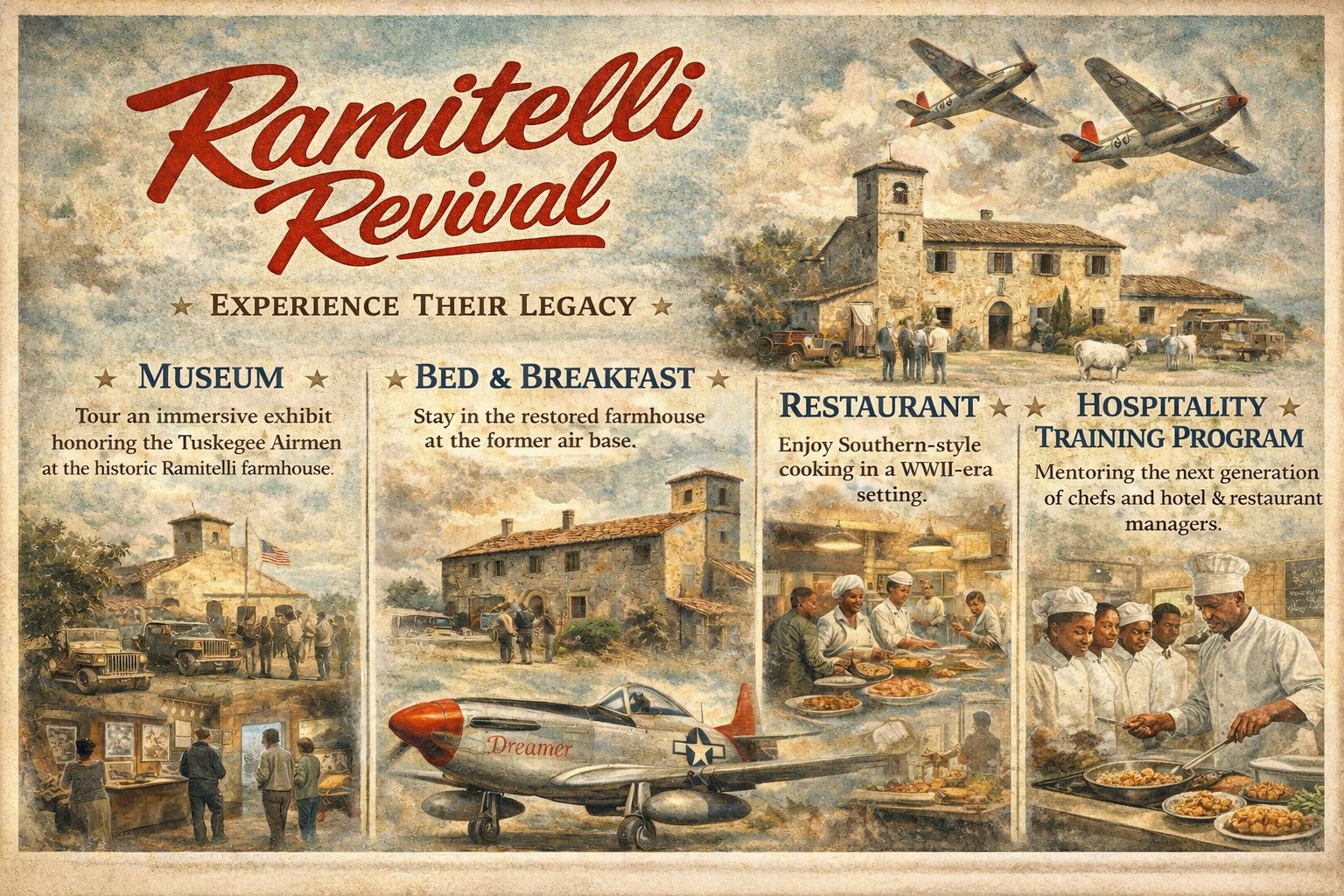 Ramitelli Revival is a nonprofit initiative restoring a historic World War II airbase connected to the Tuskegee Airmen into a museum, bed and breakfast, and restaurant designed to educate visitors, strengthen cultural ties, and create global training opportunities for young chefs and hospitality leaders.
